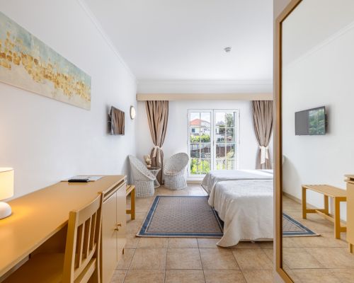 Das Standardzimmer mit Gartenblick im Hotel Quinta Alegre bietet eine komfortable und gemütliche Atmosphäre. Das Zimmer ist geschmackvoll eingerichtet und verfügt entweder über ein bequemes Doppelbett oder wenn erwünscht auch zwei separate Betten. Große Fenster ermöglichen einen schönen Blick auf den liebevoll gestalteten Garten, der dem Raum ein helles und luftiges Ambiente verleiht. Zur Ausstattung gehören ein modernes Bad, Flachbildfernseher, kostenfreies WLAN und ein kleiner Sitzbereich, ideal um sich nach einem Tag voller Erkundungen zu entspannen. Das Zimmer ist perfekt für Gäste, die eine ruhige und angenehme Unterkunft mit schöner Aussicht suchen.